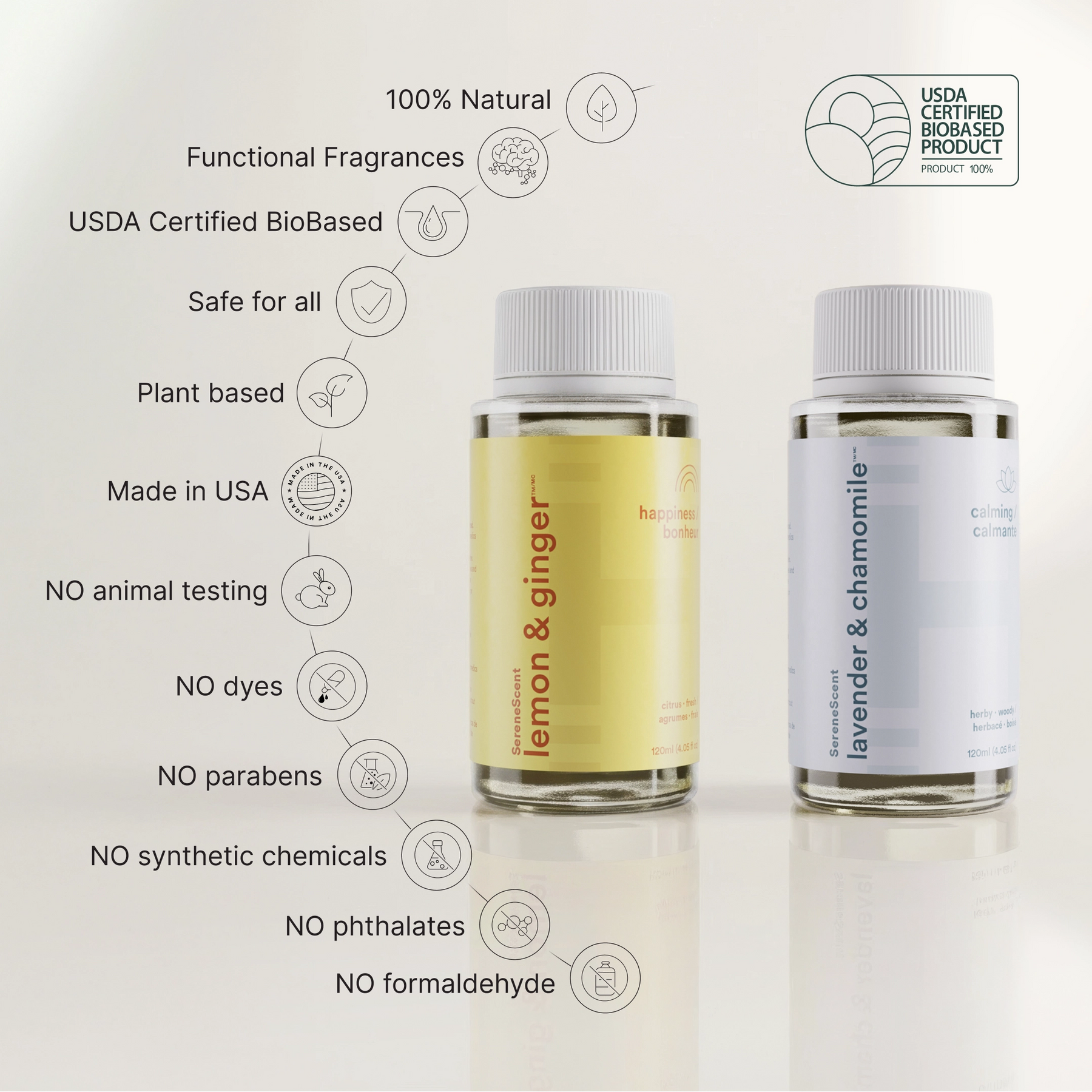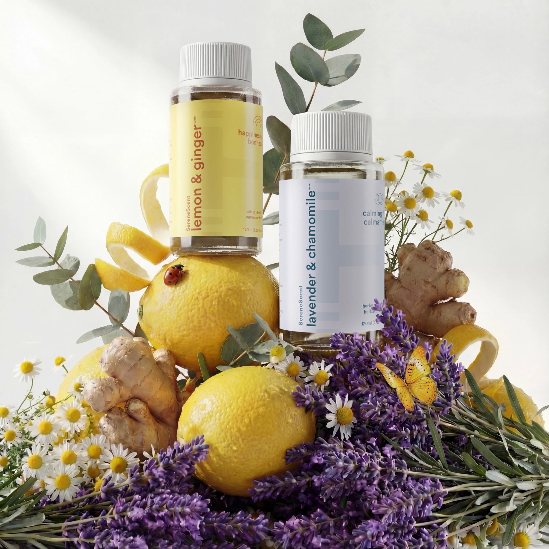 Includes the 120ml Lemon & Ginger and Lavender & Chamomile oils.