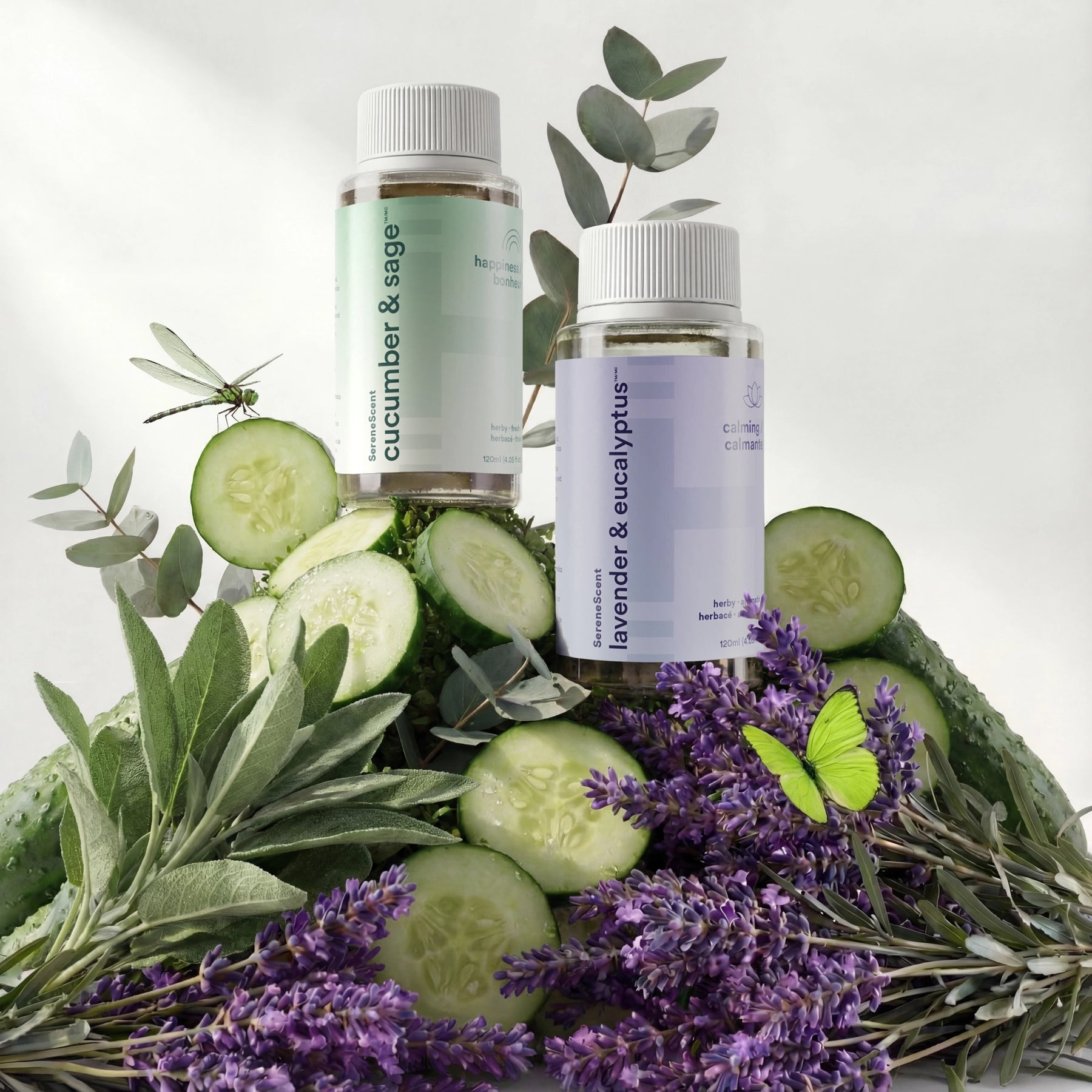 Includes the 120ml Cucumber & Sage and Lavender & Eucalyptus oils.